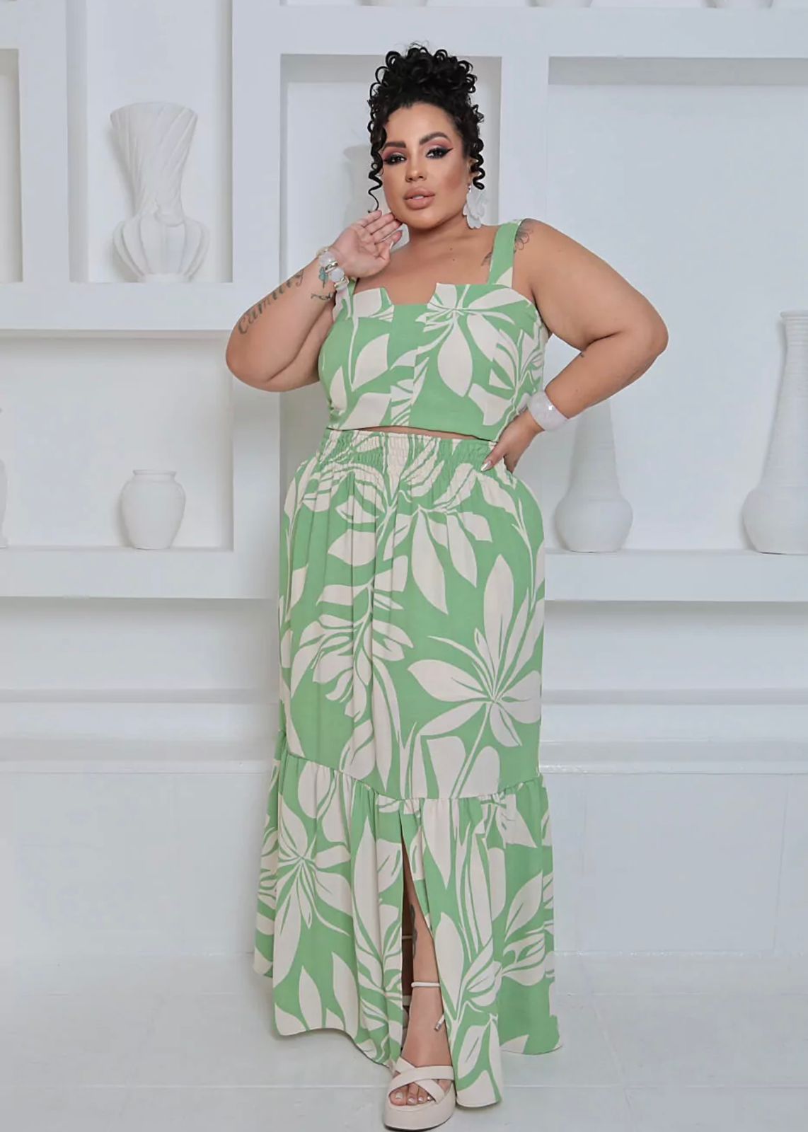 Design Sofisticado: Composto por um top de alças delicadas que valorizam o colo e uma saia elegante que proporciona movimento e charme a cada passo.