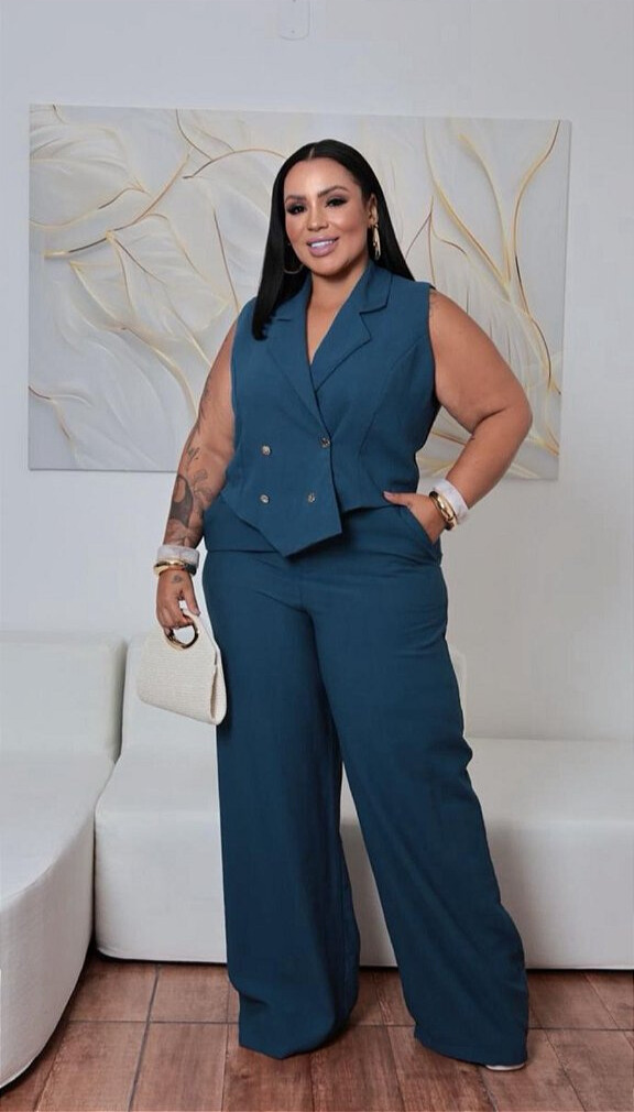 Conjunto Nara compõe colete e calça alfaitaria nos tamanhos G1 46/48 e G2 50/52